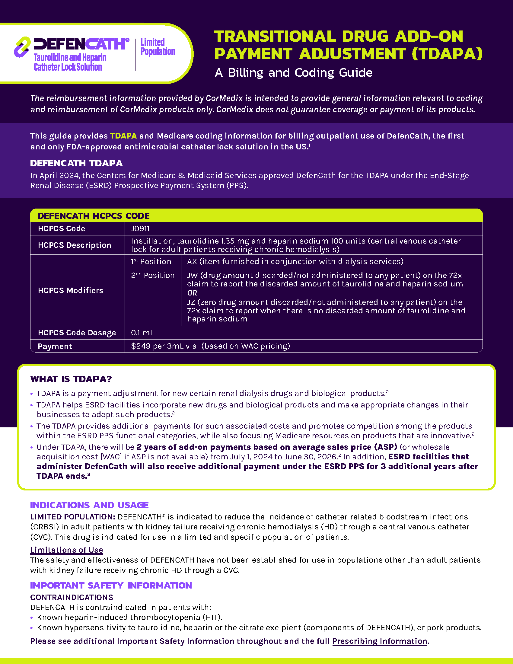 Download this guide for TDAPA billing information for DefenCath (taurolidine and heparin) catheter lock solution.