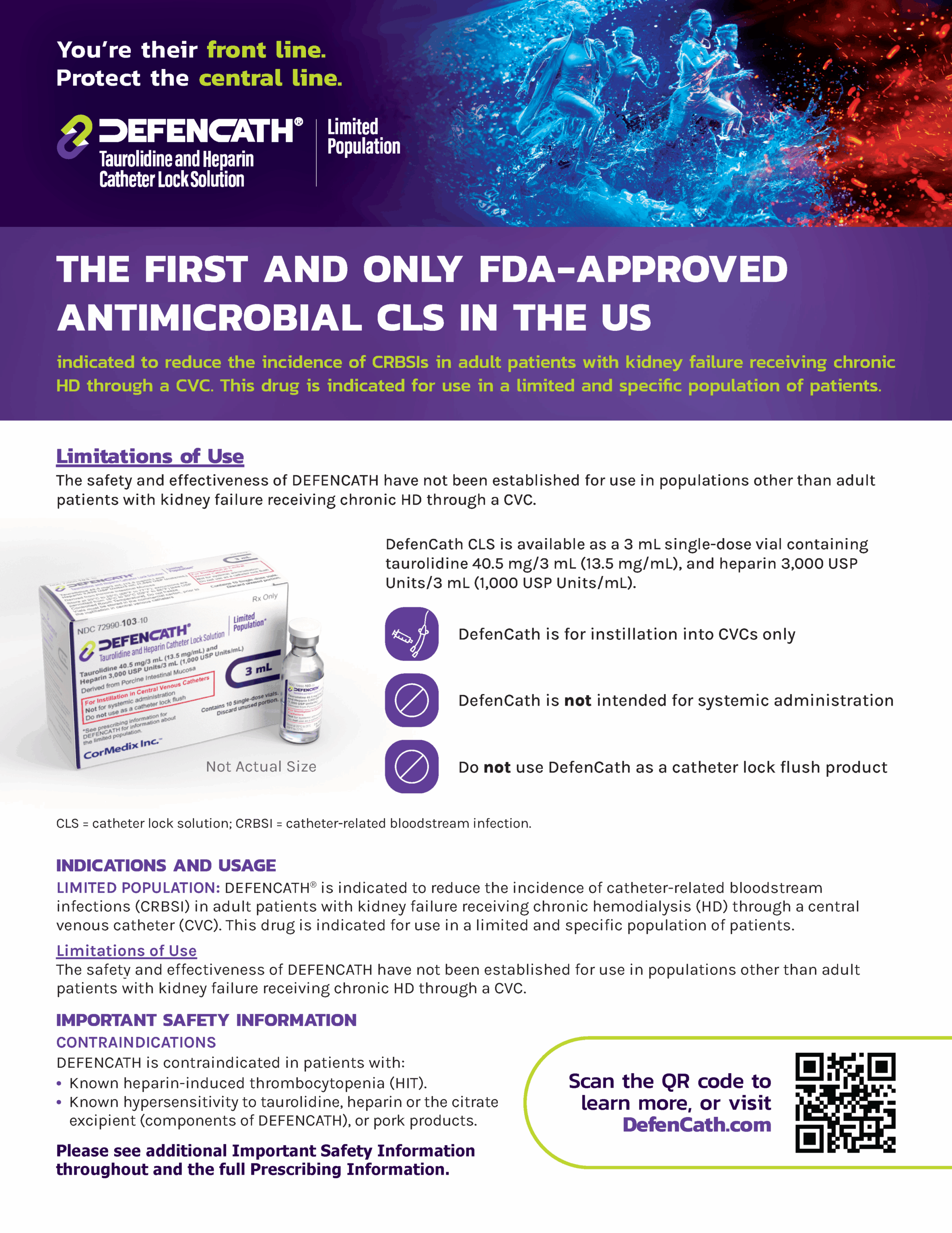 LIMITED POPULATION: DefenCath® is indicated to reduce the incidence of catheter-related bloodstream infections (CRBSI) in adult patients with kidney failure receiving chronic hemodialysis (HD) through a central venous catheter (CVC). This drug is indicated for use in a limited and specific population of patients.